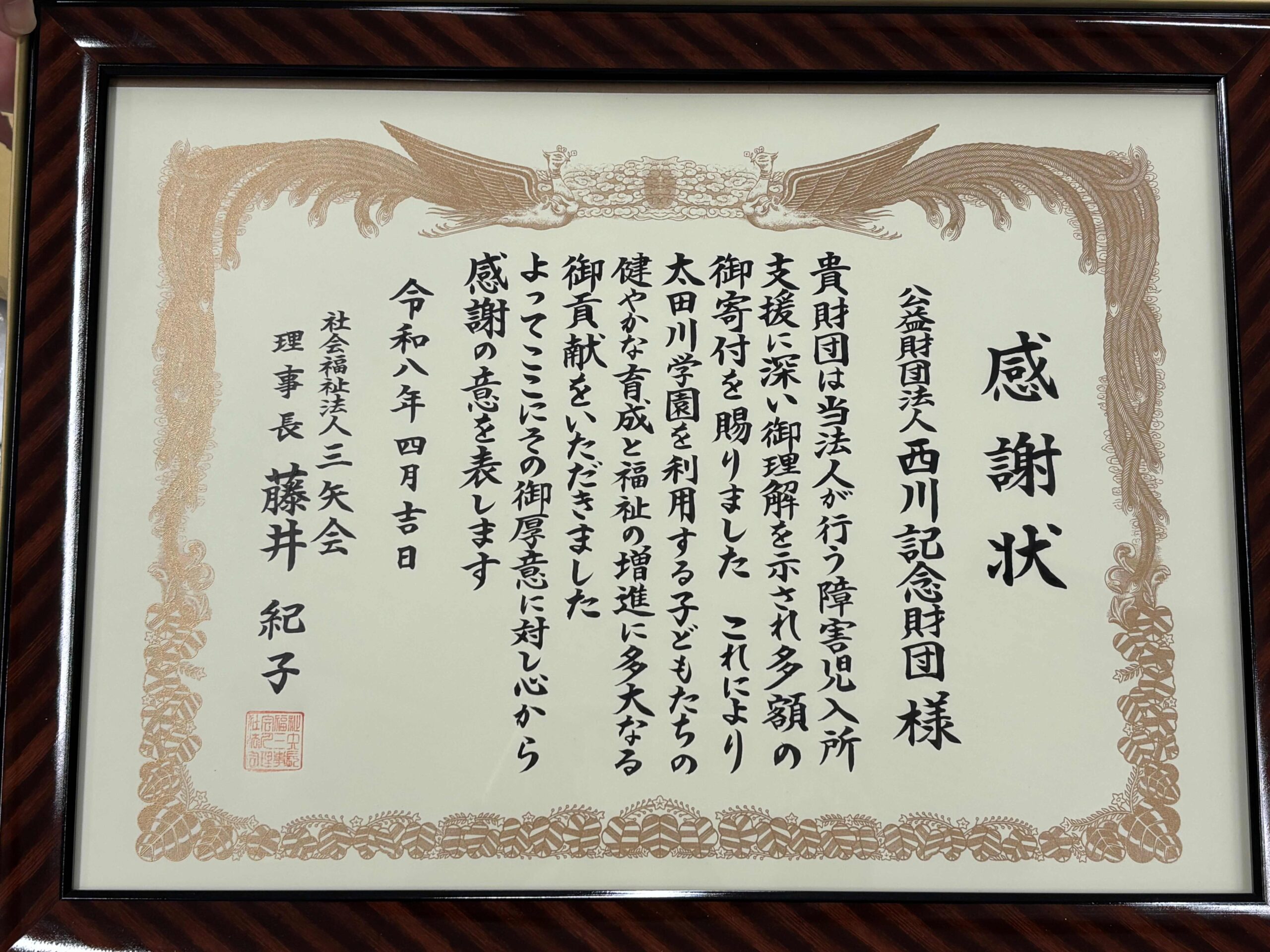 この度、公益財団法人西川記念財団様より、当法人の障害児入所支援のためにご寄付を賜りました。温かいご支援に、心より感謝申し上げます。